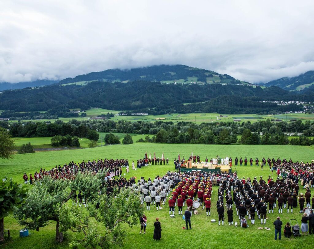 Ab 08.30 Uhr: Einmarsch der Musikkapellen beim Bildungszentrum Terfens und anschließend Hl. Messe